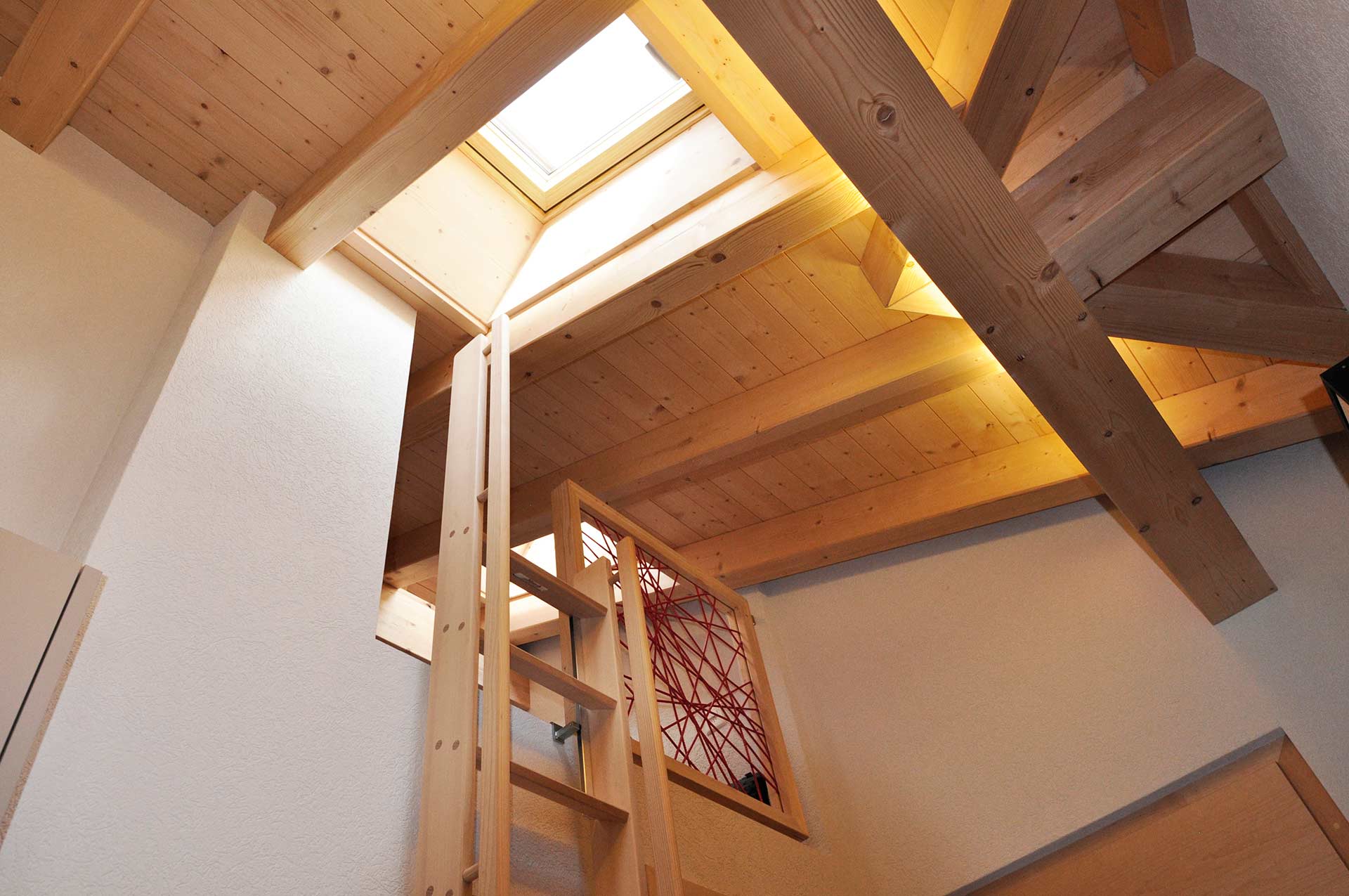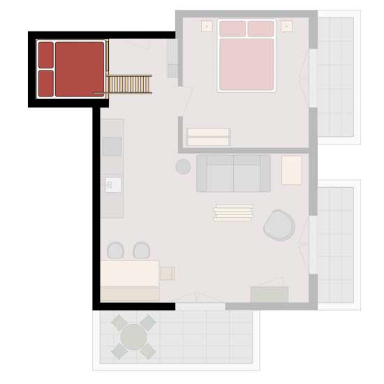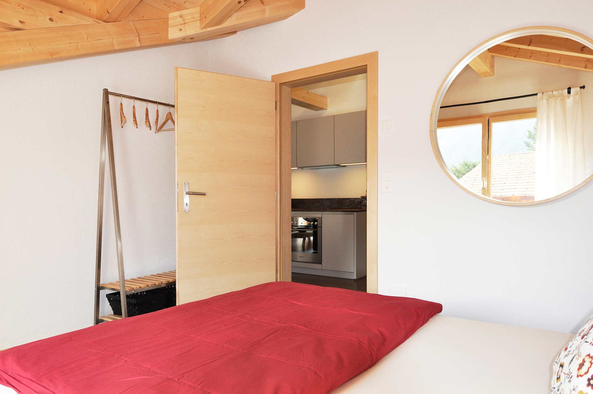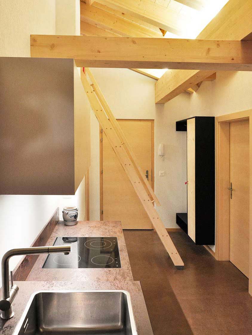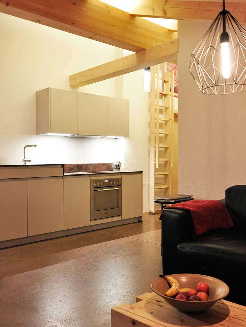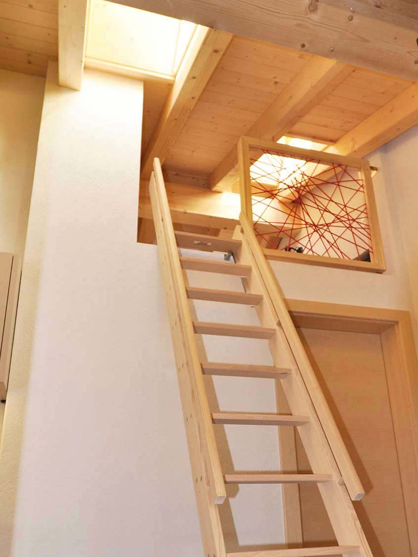 A special feature of this apartment is the small mezzanine below the roof’s ridge. A retractable staircase leads you up to this niche that contains 2 mattresses. The mezzanine can be used as a bed for two additional people. It has a small skylight through which you can watch the stars while lying in bed on a clear night.